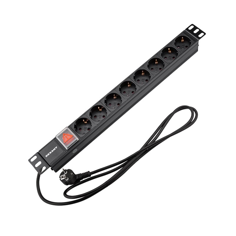 Блок распределения питания PDU горизонтальный 1U 8 розеток СЕЕ 7/4 Schuko 16A выкл алюм корп шнур 2м вилка СЕЕ 7/7 Schuko черный REXANT
