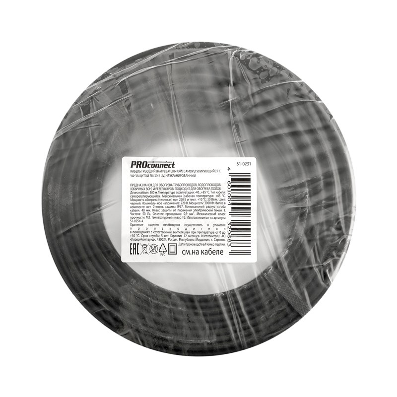 Кабель греющий (нагревательный) саморегулирующийся с УФ-защитой SRL30-2 UV, неэкранированный, 30Вт/м, 0,9мм2/55м, бухта 100м PROconnect