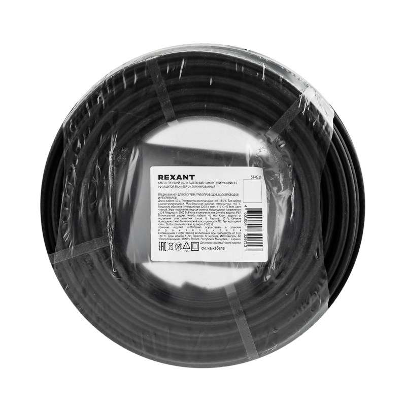 Нагревательный кабель REXANT с УФ-защитой мощностью 40 Вт/м предназначен для обогрева трубопроводов, водопроводов и резервуаров.