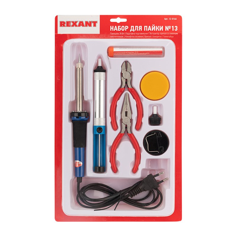 Набор для пайки №13 (паяльник 30Вт, подставка, канифоль, припой, бокорезы, тонкогубцы) REXANT
