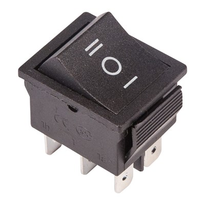 Переключатель клавишный 250V 15А (6с) ON-OFF-ON черный с нейтралью предназначен для коммутации электрических цепей переменного тока напряжением до 250В. Клавишные (Рокерные) выключатели применяются в качестве комплектующих изделий различного электрооборудования (в сетевых фильтрах и удлинителях, аудио-оборудовании, блоках питания, электроустановках на различных производствах и многих других местах). Такой клавишный переключатель имеет три положения. Принцип действия основан на перемещении клавиши в одну из позиций. Для переключения в нужное положение требуется приложить некоторые усилия на клавишу. Монтаж осуществляется без применения винтов на плоских панелях толщиной от 0.8мм до 3мм. Подключение контактов осуществляется плоской клеммой 6.6мм либо с помощью пайки.
