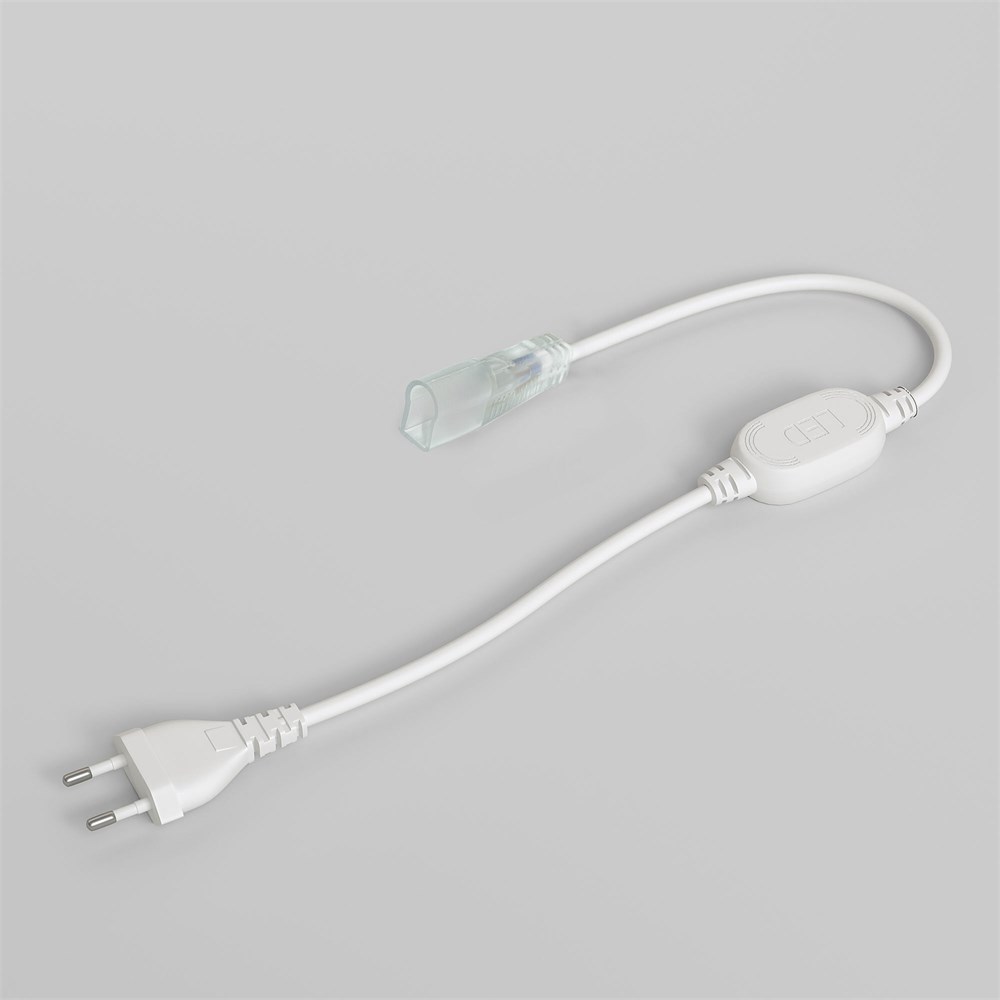 Сетевой шнур для одностороннего светодиодного гибкого неона 220V 2835 к сети питания 220 вольт. Кабель оборудован встроенным блоком питания, преобразующий переменный ток в постоянный. Сетевой шнур питания создает безопасное соединение контактов и обеспечивает бесперебойную работу светотехнического изделия.