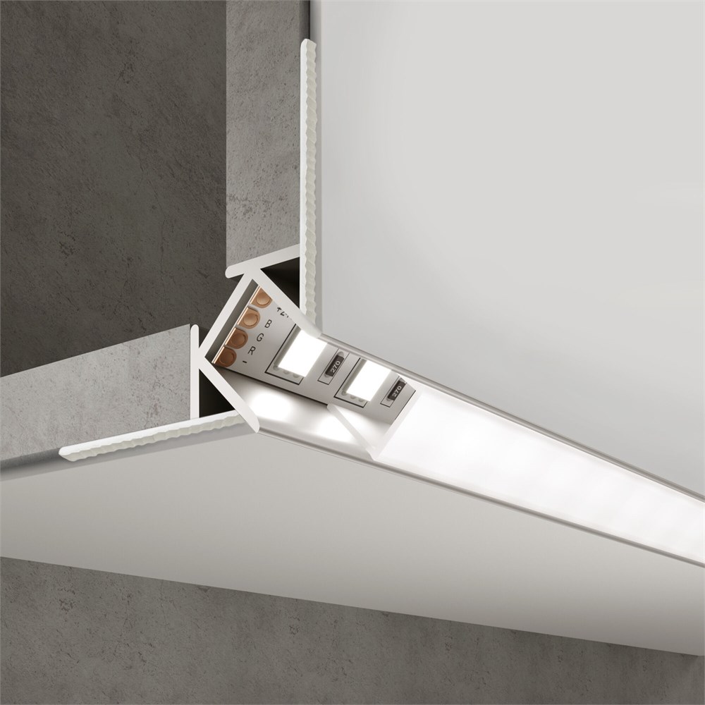 Профиль можно встраивать в пол, потолок или стены, создавая уникальные световые инсталляции. Пространство во внутренней полости профиля-основания используется в качестве кабель-канала для провода низковольтного электрооборудования.